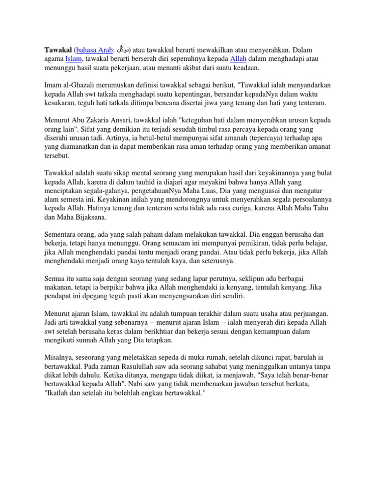Apabila arti tawakal diinterpretasikan dengan berdiam diri di sudut kamar dengan menengadahkan tangan, ini justru menghilangkan arti segala perjuangan dan jerih payah yang dilakukan oleh manusia. Seseorang yang bertawakal adalah seseorang yang menyerahkan, mempercayakan dan mewakilkan segala urusannya hanya kepada. Tawakal menurut imam ahmad bin hambal merupakan aktivitas hati. Percaya dengan sepenuh hati kepada allah (dalam. tawakal makna tawakal di kbbi adalah: